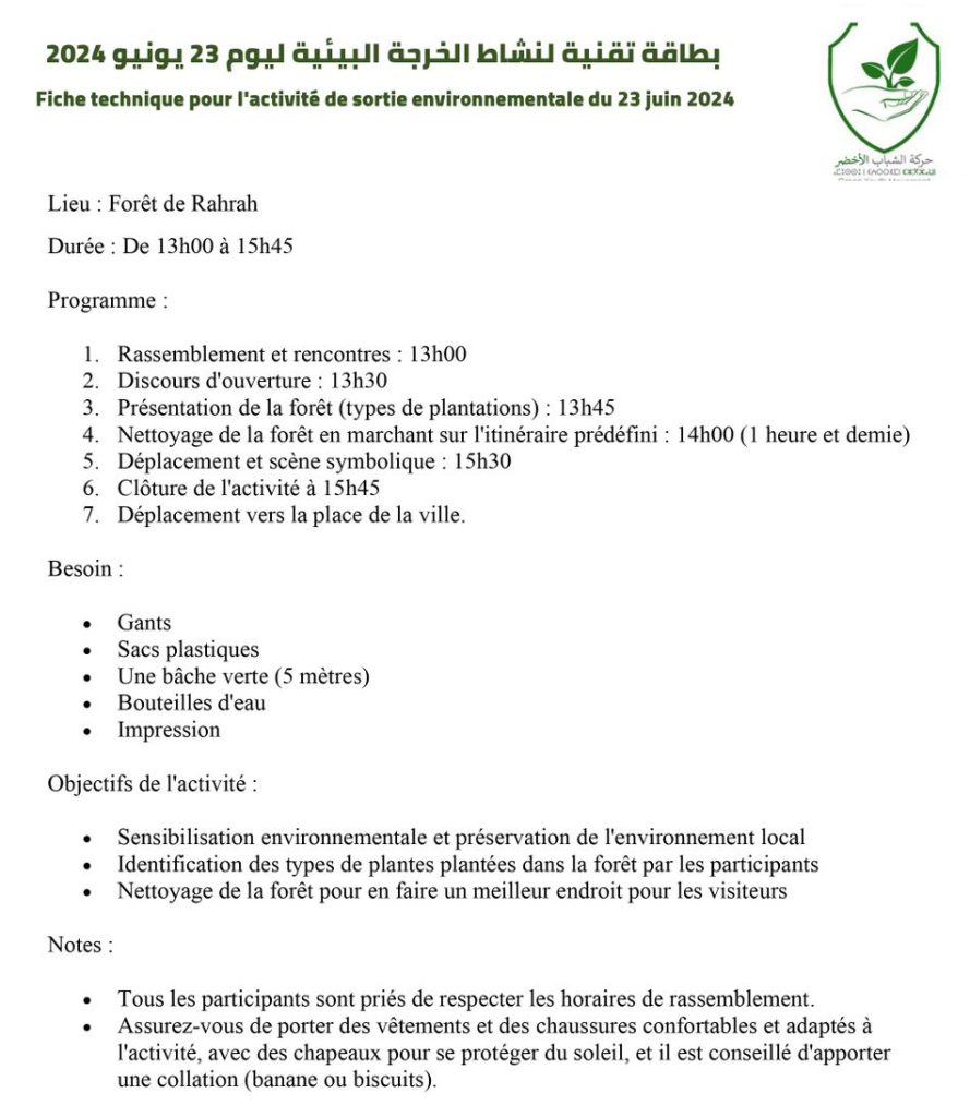 Dans le cadre de la compagne de sensibilisation qu’entreprends le mouvement GREEN YOUTH MOVEMENT, une action sera organisée, le dimanche 23 juin, sous forme d’une sortie en groupe a la forêt de Rahrah. Cette sortie coïncide avec la fin de l’année scolaire, aussi le retour des MRE, le beau temps et l’envie des citoyens de profiter de la nature et des espaces de foret.