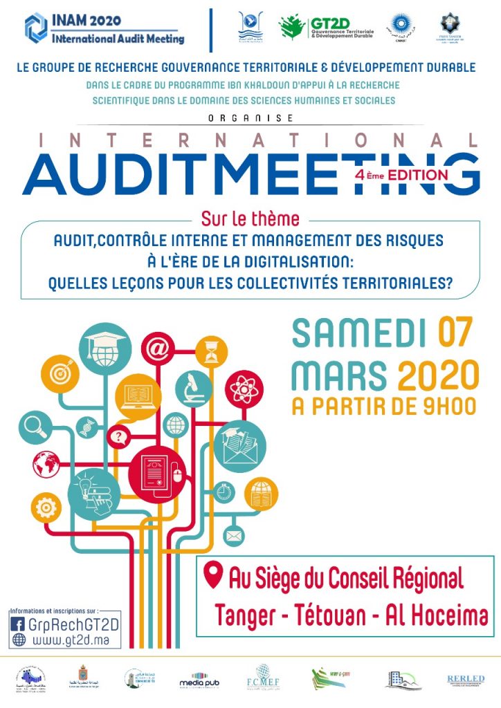 Fidèle à son engagement dans la création des échanges et débats autour des questions qui préoccupent les organisations publiques ou privées, et dans le cadre du projet de recherche Ibn Khaldoun d’appui à la recherche dans le domaine des Sciences Humaines et Sociales, le Groupe de Recherche Gouvernance Territoriale et Développement Durable GT2D de la Faculté des Sciences Juridiques, Économiques et Sociales de Tanger – Université Abdelmalek Essaâdi – organise le samedi 07 mars 2020 au sein du Conseil Régional Tanger –Tétouan – Al Hoceima la quatrième édition de l’International Audit Meeting sur le thème « Audit, Contrôle interne et management des risques à l’ère de la digitalisation : Quelles leçons pour les collectivités territoriales ? »