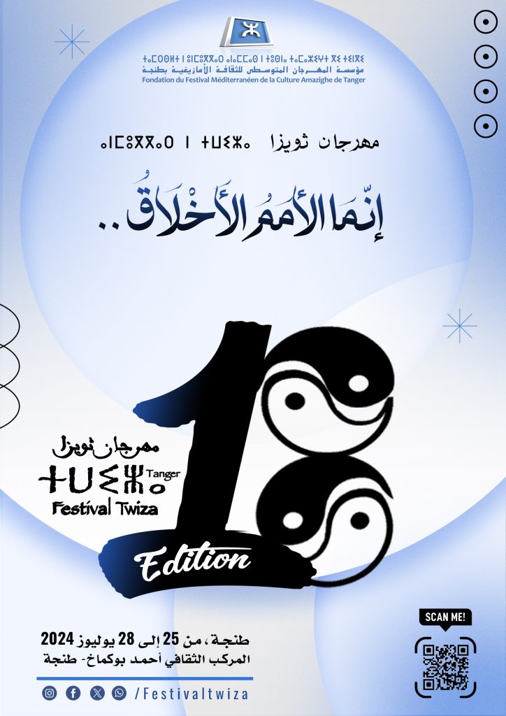 Dans le cadre de la célébration du peuple marocain du 25ème anniversaire de la succession du Souverain le Roi Mohammed 6, que dieu l’assiste, au trône ; et dans le but de l’accompagnement des dynamiques du développement du Maroc, sous la direction éclairée de Sa Majesté le Roi ; et en adhérant à la renaissance culturelle et artistique Amazighe, qui est à son apogée depuis le Discours Royal historique d’Ajdir (prononcé le 17 Octobre 2001), suivi par l’officialisation de la langue Amazighe (comme le prévoit l’article 5 de la constitution de 2011), et enfin la décision Royale de faire du Nouvel An amazigh jour férié officiel au Maroc(le 3 Mai 2023) ; et dans la concrétisation de l’ouverture de l’amazigh sur la pluralité et la diversité linguistique, culturelle et artistique à l’échelle nationale et internationale; et dans la continuité de notre engagement pour diffuser la culture du dialogue, de l’ouverture et de la tolérance, ainsi que la valorisation de l’expérience précieuse que nous avons accumulé tout au long des 17 éditions précédentes du Festival Twiza, en organisant plusieurs conférences, symposiums, expositions, et concerts, avec la participation de plusieurs artistes, écrivains et intellectuels marocains et étrangers ; la Fondation du Festival Méditerranéen de la Culture Amazighe de Tanger organise la 18ème édition du Festival Twiza, du Jeudi 25 au Dimanche 28 juillet 2024, sous le thème : « Les nations prévalent tant qu’elles préservent leurs morales..» , le slogan de cette édition est inspiré du vers poétique éternel :« les nations prévalent tant qu’elles préservent leurs morales, mais si elles perdent leurs valeurs morales elles seront vouées au péril. »